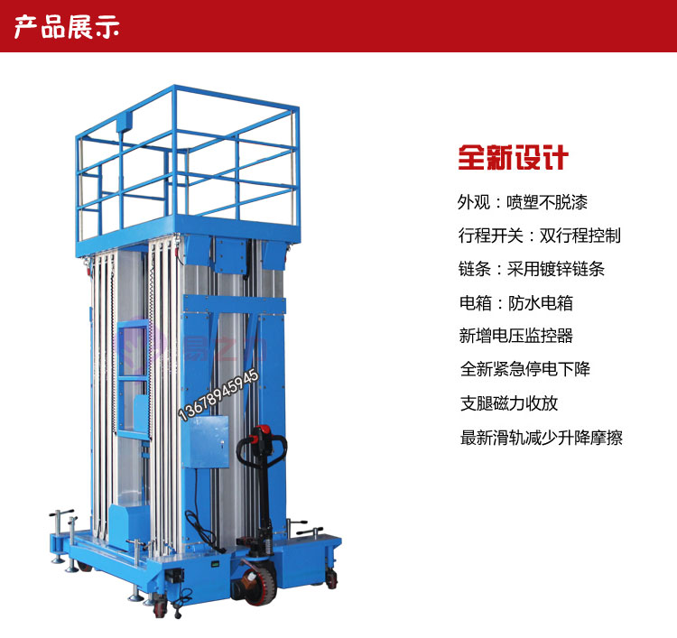 鋁合金升降機(jī)采用高強(qiáng)度優(yōu)質(zhì)鋁合金材料,具有造型美觀、運(yùn)轉(zhuǎn)靈活,推行方便。升降平穩(wěn)、安全可靠等優(yōu)點(diǎn)。它輕盈的外觀,能在極小的空間內(nèi)發(fā)揮較高的舉升能力。廣泛用于工廠、賓館、餐廳、車(chē)站、影劇院、展覽館等場(chǎng)所,是保養(yǎng)機(jī)具、油漆裝修、調(diào)換燈具、電器、清潔保養(yǎng)等用途的理想安全伴侶。